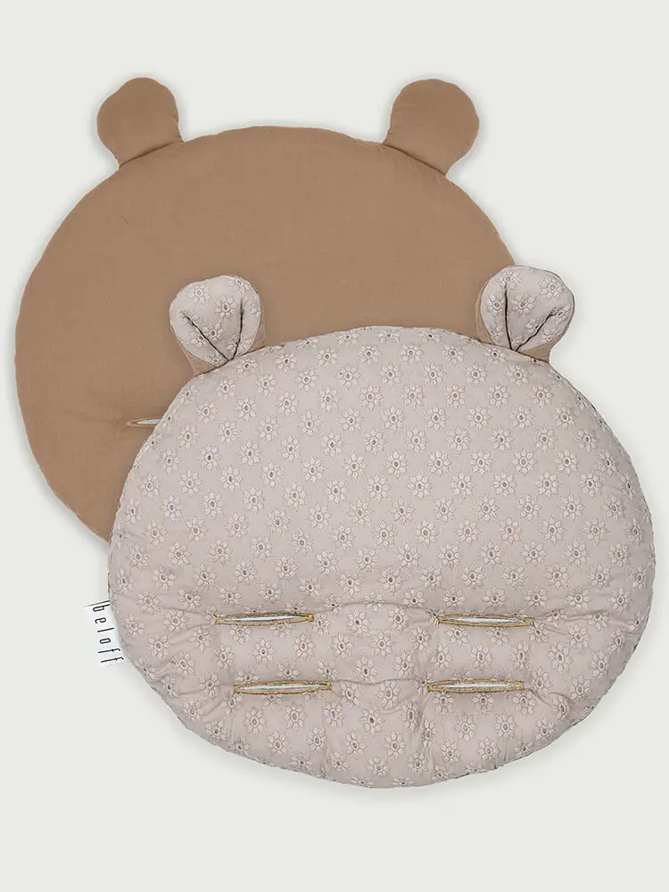 Muślinowa poduszka płaska do wózka z otworami na pasy w kształcie główki Misia z uszkami świetnie sprawdzi się na codziennych spacerach. Można jej używać już od pierwszego dnia życia. Z jednej strony poduszka jest we wzorze Kwiatów Bawełny na śmietankowym tle, druga strona jest bez wzorów w kolorze kawy z mlekiem. Obie strony uszyte są w muślinu 100%. Poduszka posiada puszyste wypełnienie ok. 5 cm.